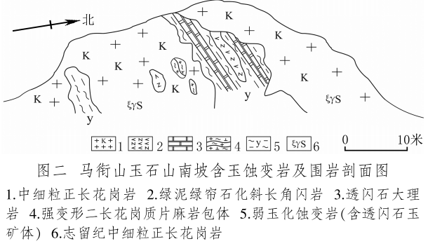 馬銜山玉礦分布在馬銜山東南部的玉石山(圖版一),海拔3028米。山上出露的地質(zhì)體主要為古元古界馬銜山巖群、中元古代片麻二長花崗質(zhì)巖[3]和志留紀正長花崗巖及正長巖。馬銜山巖群的巖性為黑云斜長片麻巖、變粒巖、斜長角閃巖和白云質(zhì)大理巖,巖石普遍遭受了韌性變形,變余糜稜巖發(fā)育。志留紀巖漿侵入期后熱液活動較強,石英脈細脈發(fā)育,局部見螢石礦化或礦床[4]。玉礦化主要產(chǎn)于馬銜山巖群與志留紀正長花崗巖和正長巖接觸帶上(圖版二),具體賦存在與白云質(zhì)大理巖的接觸部位,是正長花崗巖及正長巖與鎂質(zhì)大理巖接觸交代蝕變的產(chǎn)物[5]?;◢弾r與片麻巖、變粒巖和斜長角閃巖接觸界線附近巖石雖有蝕變,但不見玉化蝕變巖或玉石出露。在近山頂開采玉石揭露的一個地質(zhì)剖面清晰地顯示了這些特征(圖二)。該剖面大致呈東西走向,長約50米,馬銜山巖群多呈殘留體出露,斜長角閃巖綠泥綠簾石化強烈,大理巖普遍發(fā)生蝕變,形成透輝透閃石大理巖,緊靠花崗巖接觸地帶發(fā)育窄窄的透閃石玉礦帶。現(xiàn)在人們找玉,也主要在該剖面上的花崗巖和鎂質(zhì)大理巖的接觸帶上鑿洞,在接觸帶上見有多處采挖玉石的洞穴。在該剖面西側(cè)約50米,發(fā)育有正長巖與大理巖的混染帶,肉紅色正長巖中包裹混染著大量灰綠色透閃透輝大理巖,部分已蝕變?yōu)橥搁W透輝石巖,且質(zhì)地較細膩,成為半玉化巖石。剖面和周圍地質(zhì)特征表明,玉礦的形成是早古生代志留紀花崗質(zhì)雜巖體侵入到古元古代鎂質(zhì)大理巖,發(fā)生接觸交代蝕變作用的結(jié)果,在兩種巖石接觸帶形成玉礦體。但并不是蝕變帶中的巖石都是透閃石玉石,透閃石玉在蝕變帶中多呈雞窩狀或不規(guī)則狀分布,少量呈脈狀出露。從剖面及部分采坑的規(guī)模來看,玉礦體向深處有變大、變好的趨勢,這主要受控于接觸面產(chǎn)狀,在傾角較緩處礦體相對較大。橫向上在背離接觸面方向圍巖具有從透閃石玉到透閃透輝石玉、透閃透輝石大理巖再到含透閃石大理巖的變化特征,反映了交代蝕變強度與接觸帶溫度及熱液成分變化的密切關(guān)系。從玉礦體到蝕變圍巖由于成分和結(jié)構(gòu)的變化出現(xiàn)一系列不同類型的玉石或巖石。我們在剖面上采集到一些小塊的淡綠色玉料(圖版三)和出露較寬的微晶大理巖,經(jīng)偏光顯微鏡下薄片鑒定和XRF檢測,確定有透閃石玉、透輝透閃玉、透閃透輝石玉、透閃透輝石大理巖和含透閃石大理巖等,這與馬家窯遺址出土的齊家文化時期大部分玉質(zhì)品玉料類型基本一致[6]。部分地段近礦圍巖還有透輝石巖、透輝矽卡巖、矽卡巖化大理巖、蛇紋石化大理巖、斜長透輝石巖等。玉石山的采洞(坑)由于資源與環(huán)境保護的要求,大多已被填埋,但仍可見采坑殘留的位置。采洞(坑)均位于大理巖與正長花崗巖接觸帶靠近大理巖一側(cè),這也間接顯示了玉礦體的位置。此外,玉石山花崗巖中石英細脈較發(fā)育,局部可見螢石礦化,反映了花崗巖侵入期后低溫熱液活動仍較強,對玉礦也有一定的改造影響。