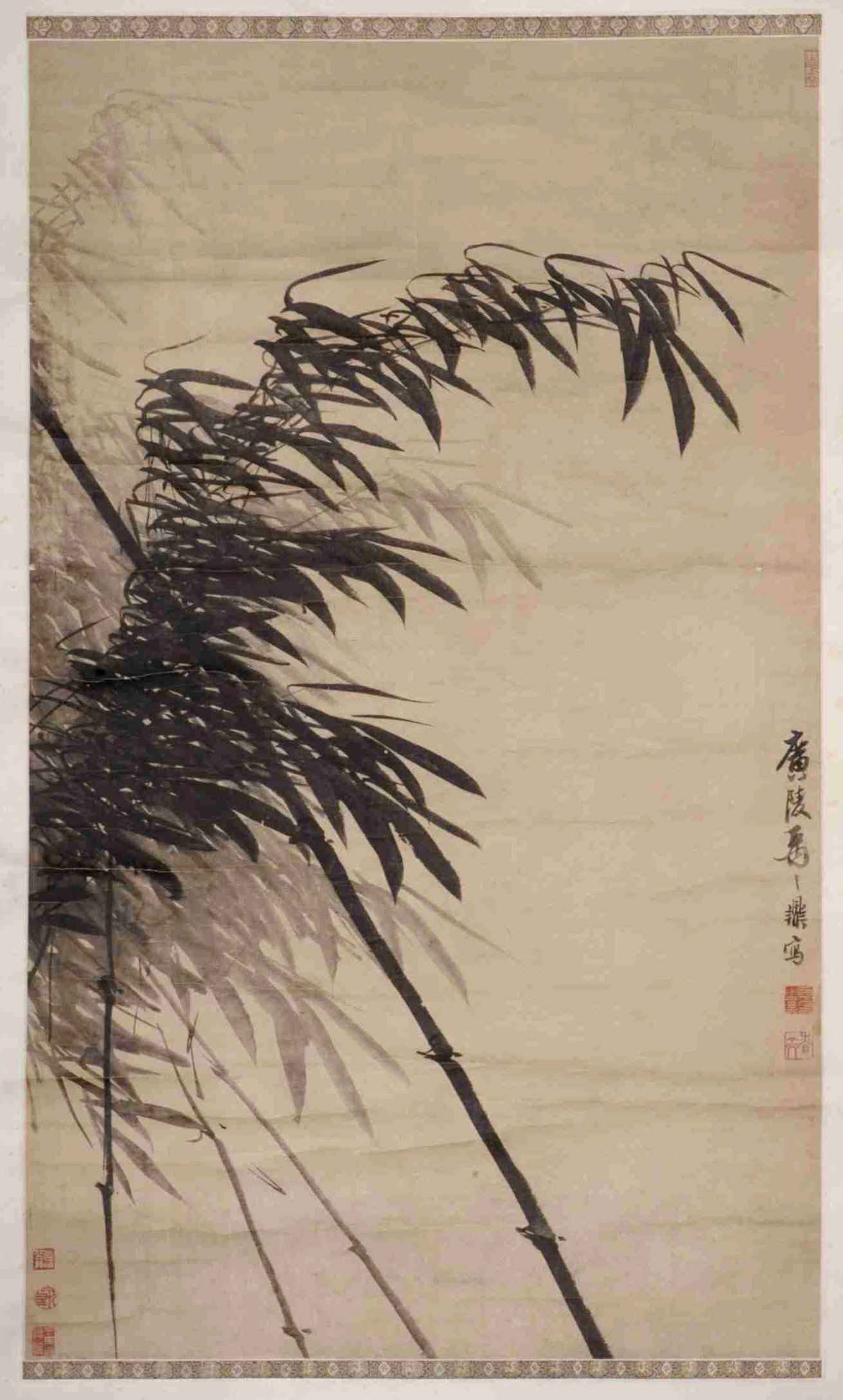 甘肅省博物館現(xiàn)藏有禹之鼎墨竹圖軸一幅,繪者運用筆墨技法,通過墨色的濃淡變化和線條的疏密組合,生動描繪出疾風(fēng)吹拂而竹子迎風(fēng)挺立、不甘折腰,展現(xiàn)出竹子的剛正堅直、挺拔不屈生命力與韻味,圖軸右側(cè)題款“廣陵禹之鼎寫”。