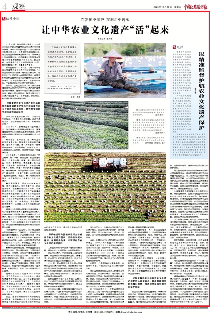 農(nóng)業(yè)文化遺產(chǎn)保護任重道遠。申遺成功并非終點,而是新的起點,后續(xù)仍需持續(xù)挖掘和推廣系統(tǒng)價值。屬地紀檢監(jiān)察機關(guān)立足職能職責,主動將農(nóng)業(yè)文化遺產(chǎn)保護納入監(jiān)督重點,著力推動農(nóng)業(yè)文化遺產(chǎn)在發(fā)掘中保護、在利用中傳承,推進中華優(yōu)秀農(nóng)耕文化保護傳承。