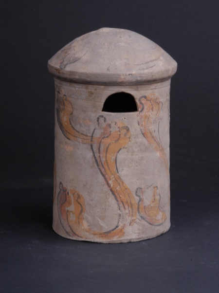 漢代,酒泉北稍門外出土。高19.4厘米,底徑11.6厘米。筒狀,球面頂,上部有一拱形倉門,筒身飾紅、黃、黑彩繪云氣紋。展現(xiàn)了當(dāng)時(shí)糧食豐收后的貯藏場景與人們對豐饒的祈愿。