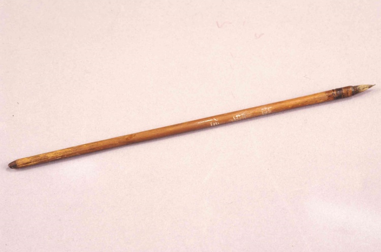 東漢,長21.9厘米,直徑0.6厘米,筆尖長0.6厘米。竹制筆桿,端直均勻,管狀中空,外表為淺褐色,包筆頭處稍有收分,筆桿前端縛扎絲線并且髹(xiū)漆。筆芯及鋒呈黑紫色,外覆較軟的黃褐色毛,剛?cè)岵挥袕椥?。筆桿中部有陰刻隸書“白馬作”三字。尾端削為鈍尖,便于簪插。漢代仍保留著“物勒工名”的傳統(tǒng),“白馬”當(dāng)為制作此筆的工匠名。此筆制作精良,且銘刻有制作者姓名,格外珍貴。