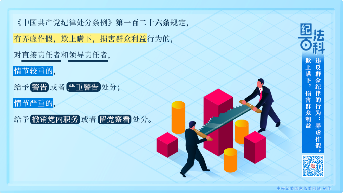 《中國共產(chǎn)黨紀律處分條例》第一百二十六條規(guī)定,有弄虛作假,欺上瞞下,損害群眾利益行為的,對直接責任者和領導責任者,情節(jié)較重的,給予警告或者嚴重警告處分;情節(jié)嚴重的,給予撤銷黨內(nèi)職務或者留黨察看處分。