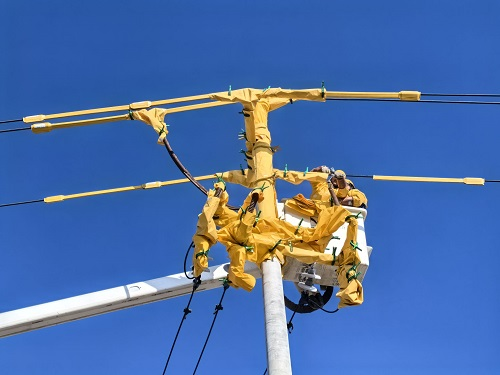 作業(yè)現(xiàn)場,嚴(yán)寒逼人,但準(zhǔn)備井然有序。該公司相關(guān)負責(zé)人提前組織現(xiàn)場勘查,制定“三措一案”,反復(fù)預(yù)演操作流程。絕緣斗臂車、絕緣手套、遮蔽毯等器具逐一檢查確認,確保萬無一失。上午11時10分,兩名作業(yè)人員穿戴好絕緣防護裝備,乘絕緣斗臂車緩緩升至12米高空,逐步對導(dǎo)線、橫擔(dān)、桿塔等帶電部位進行絕緣遮蔽,構(gòu)建起安全作業(yè)屏障。隨后,他們依照標(biāo)準(zhǔn)化作業(yè)指導(dǎo),沉穩(wěn)細致地完成三相引流線的搭接工作。