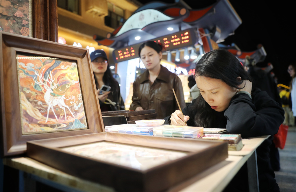 參照古代《清明上河圖》式的市集布局,夜市以“一街六坊”劃分出工藝品、美食、展演等主題區(qū)域。鳴沙山下的沙州木雕、敦煌畫(huà)院監(jiān)制的彩塑盲盒、非遺匠人現(xiàn)場(chǎng)演示的壁畫(huà)臨摹技藝,構(gòu)建起可觸可感的文創(chuàng)矩陣。重頭戲《敦煌樂(lè)舞》實(shí)景秀中,反彈琵琶伎樂(lè)天踩著懸空透明舞臺(tái)翩翩起舞,千年洞窟壁畫(huà)躍然眼前。夜市負(fù)責(zé)人介紹:“我們精選了24項(xiàng)非遺項(xiàng)目入駐,要讓傳統(tǒng)文化在煙火氣里活起來(lái)。”