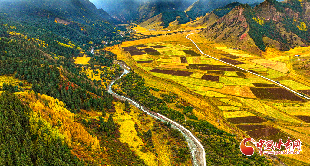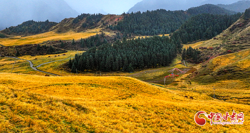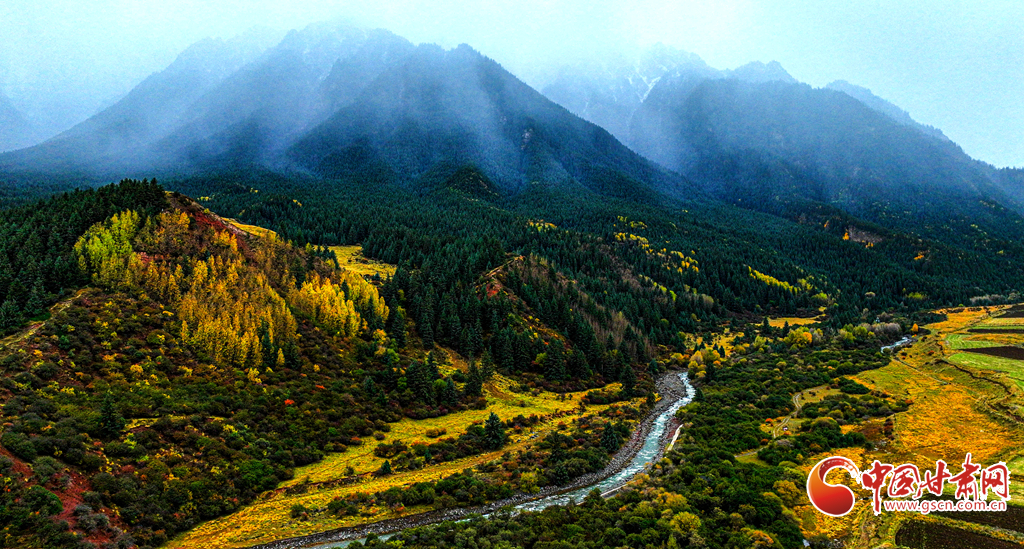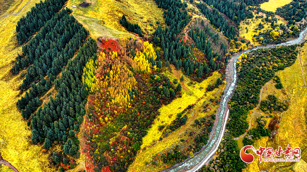 金秋十月,祁連山國家公園迎來最絢爛的季節(jié)。雪峰映照著斑斕林海,山霧繚繞其間,原始森林、雪山、草甸、霜葉構(gòu)成垂直景觀帶。雪白、金黃、深紅與湛藍(lán)交相輝映,黃綠為底,紅金點染,宛如一幅渾然天成的油畫。