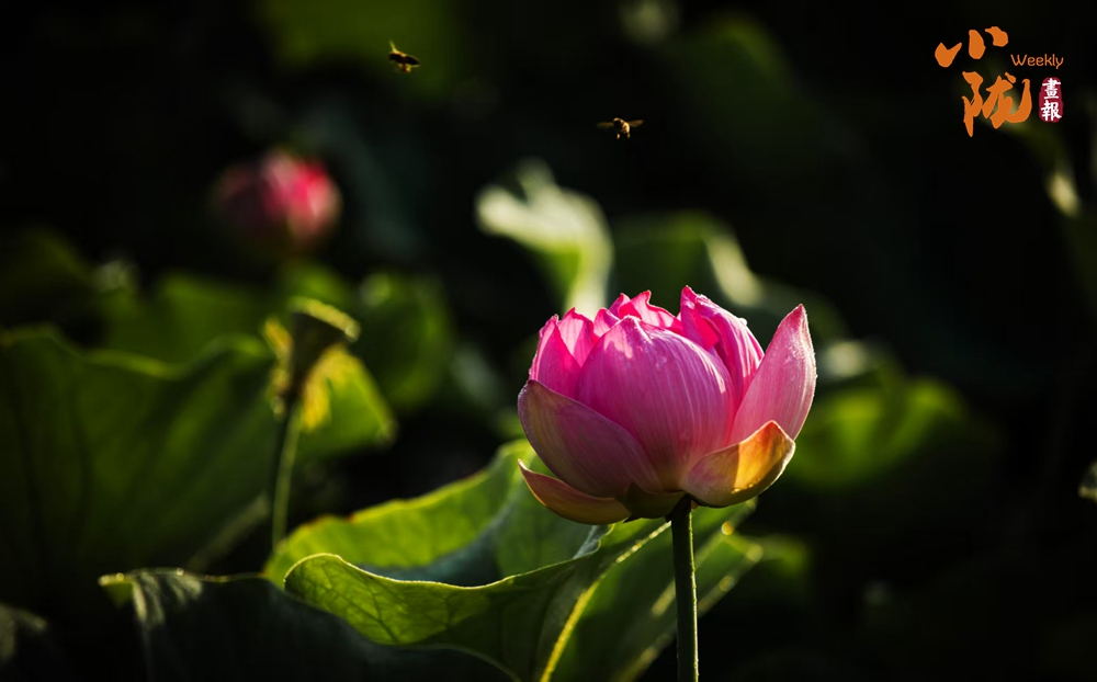 荷花成片盛開,偶有蜜蜂飛來飛去,時而駐足在花苞尖上,時而又快速飛向另一朵荷花,構(gòu)成了一幅靈動的“蜜蜂戲荷圖”。水中的魚兒也不甘寂寞,穿梭在荷葉間,偶爾躍出水面,濺起朵朵水花,為這靜謐的荷塘增添了幾分生機。