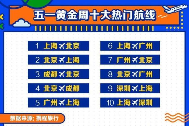 《報(bào)告》稱,今年五一期間,消費(fèi)者跨省出游意愿強(qiáng)烈,攜程機(jī)票單日訂單量對(duì)比2019年同期最高增幅約28%。上海-北京、北京-上海、成都-北京、北京-成都、廣州-上海、上海-廣州、廣州-北京、北京-廣州、深圳-上海、上海-深圳為“五一”黃金周十大熱門航線。