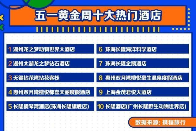 數(shù)據(jù)顯示,攜程酒店預(yù)訂間夜以及GMV在假期前三天連續(xù)突破平臺(tái)歷史峰值,對(duì)比2019年同期,單日訂單量增幅最高達(dá)70%。湖州龍之夢(mèng)動(dòng)物世界大酒店、湖州太湖龍之夢(mèng)鉆石酒店、無錫拈花灣拈花客棧、惠州雙月灣檀悅都喜天麗度假酒店、長隆橫琴灣酒店(珠海長隆旗艦店)、珠海長隆海洋科學(xué)酒店、珠海長隆企鵝酒店、惠州雙月灣檀悅豪生溫泉度假酒店、上海金茂君悅大酒店、長隆酒店(廣州長隆野生動(dòng)物世界店)為今年“五一”黃金周熱門酒店TOP10。
