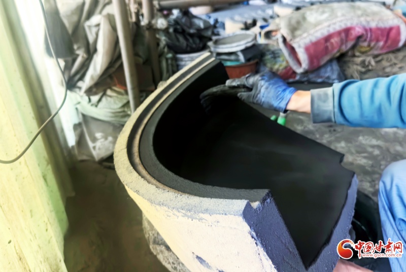 如果說兌沙是技藝的根基,那“制模”便是它的靈魂。團沙成坯、旋出弧度、拍實定型、分塊剪下,再用刻刀一點點勾勒出內(nèi)壁的紋路,接著在模具上精雕出藏八寶、龍紋等花紋,最后將外殼合在內(nèi)模上、抹平縫隙、層層加固——一套模具經(jīng)歷這些工序才能慢慢成型,但是澆筑后便會碎毀。