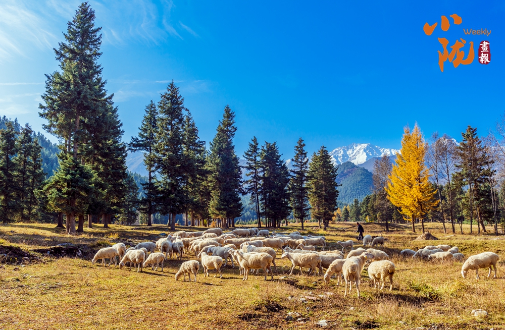 大地披上了金色的盛裝,悠然自得的羊群、五彩的樹木,與遠(yuǎn)處的雪山和湛藍(lán)的天空、潔白的云朵,共同繪制成一幅初冬最亮麗的風(fēng)景畫。