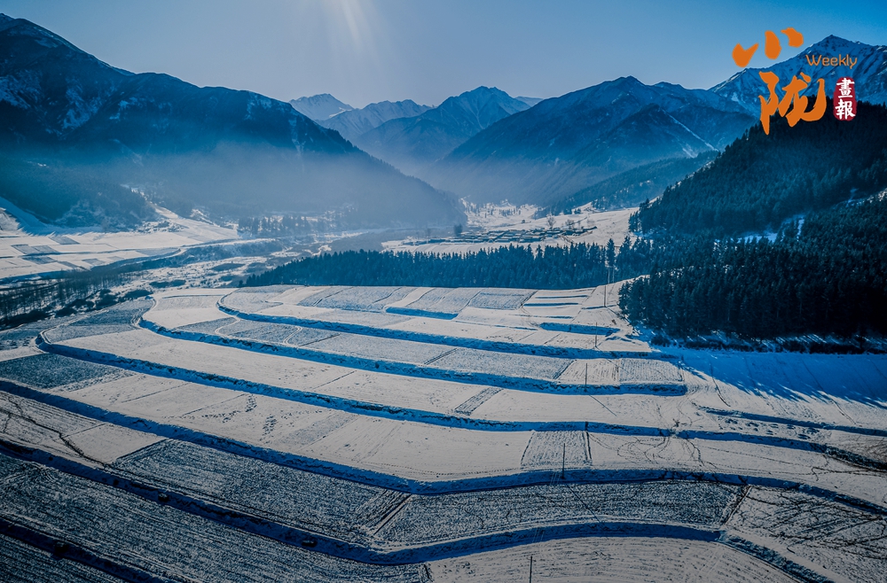 融雪斑駁似玉,在陽光的映照下熠熠生輝。輕柔鋪展的白雪將起伏的山巒、靜默的松林和山鄉(xiāng)小居悉數(shù)包裹,盡展初冬的浪漫與詩情畫意。