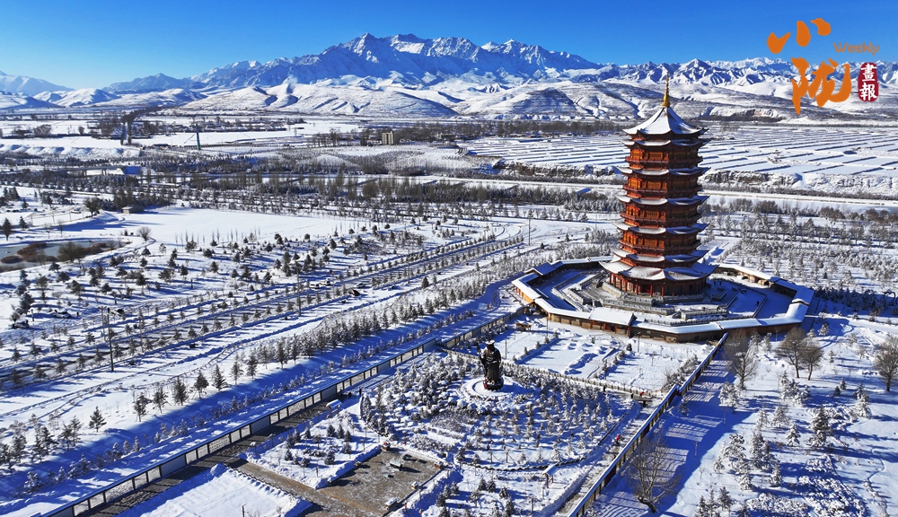 雪后初霽,銀白的民樂公園,在陽(yáng)光下熠熠生輝,安靜且神秘,與遠(yuǎn)處綿延的祁連山構(gòu)成一幅璀璨的畫卷。