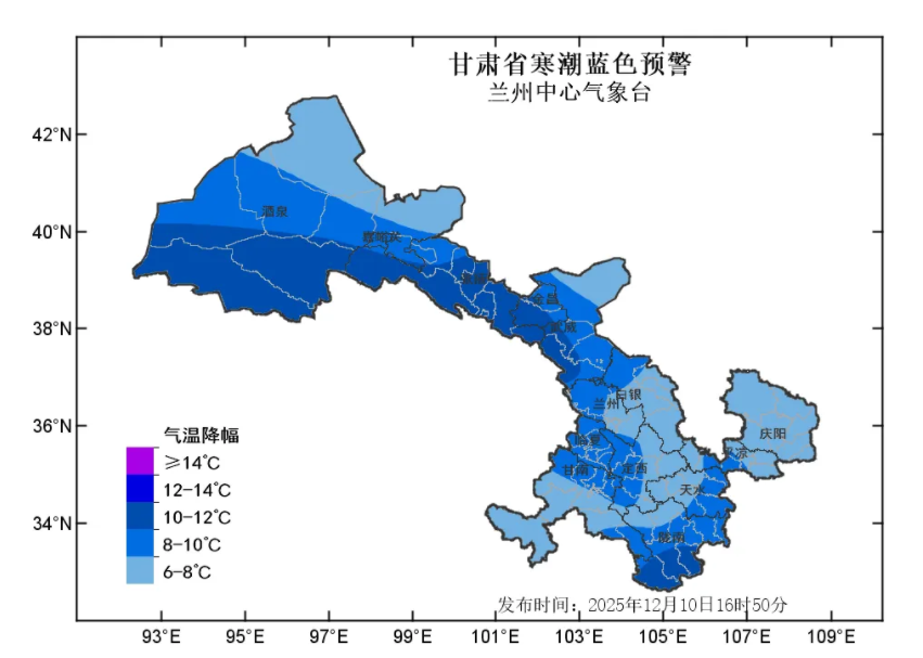 蘭州中心氣象臺2025年12月10日16時50分發(fā)布寒潮藍色預警:預計11日至13日清晨,全省大部自西向東最低氣溫下降6-8℃,其中河西五市、隴南等部分地方及隴中局部地方下降8~10℃,局地可達10℃以上,上述部分地方將出現(xiàn)寒潮。河西五市降溫時段為11日白天至12日白天,省內(nèi)其余地方降溫時段為11日夜間至13日清晨。請注意防范!